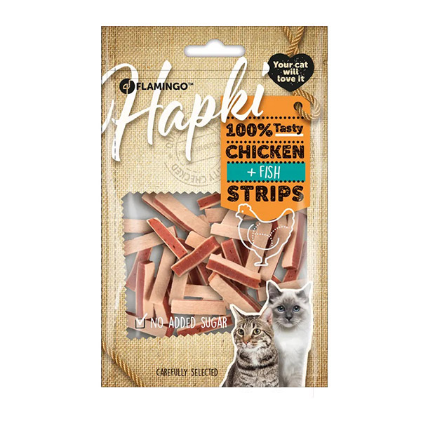 اسنک استریپس از برند فلامینگو یک تشویقی محبوب برای گربه ها با طعم مرغ و ماهی بوده که از سن 6 ماهگی قابل استفاده است. این محصول فاقد قند افزودنی می باشد.