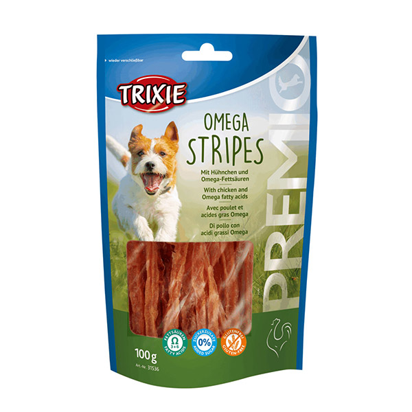 تشویقی سگ مدادی امگا از برند تریکسی حاوی 85% گوشت سینه مرغ و غنی از اسیدهای چرب ضروری است. این محصول فاقد گلوتن بوده و با دستگاه گوارش سازگار می باشد.