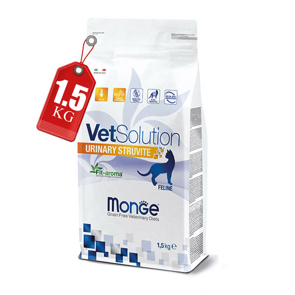 غذای گربه 1.5 کیلویی مونژه مدل یورینری برای درمان سنگ های دستگاه ادراری از نوع استراویت تولید شده و به انحلال آن ها کمک می کند.