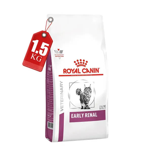 غذای ارلی رنال Early Renal از محصولات رویال کنین با وزن 1.5 کیلوگرم برای گربه های بالغ مبتلا به نارسایی کلیوی استیج یک تولید شده است.
