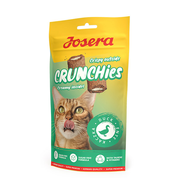 تشویقی گربه جوسرا Josera Crunchies Duck به صورت کرانچی مغزدار با طعم اردک تولید شده که غنی از تائورین، ویتامین ها و مواد معدنی است.