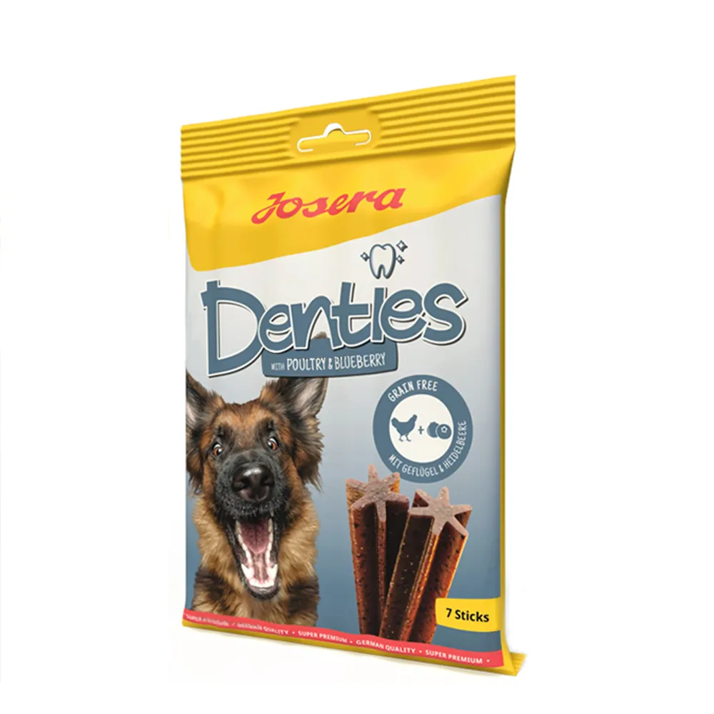 تشویقی دنتال جوسرا Denties Poultry محصولی با طعم مرغ و بلوبری است که به سلامت دندان های سگ کمک کرده و مانع از تشکیل جرم و پلاک می شود.