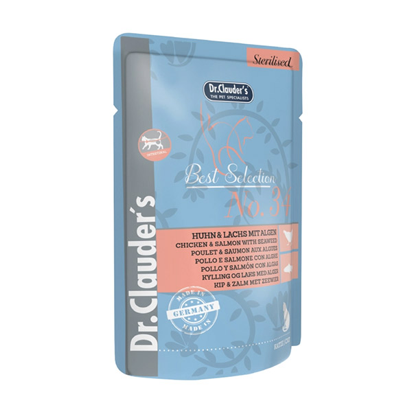 پوچ استریلایزد با طعم مرغ و سالمون Sterilised Chicken & Salmon دکتر کلادرز برای گربه های بالغ عقیم شده تولید شده و غنی از اسیدهای چرب ضروری است.