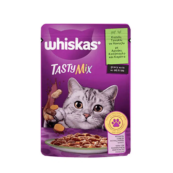 پوچ گربه ویسکاس با طعم بره و مرغ Whiskas Lamb & Chicken یک وعده کامل غذایی به صورت خورشتی و سرشار از پروتئین، ویتامین ها و مواد معدنی می باشد.