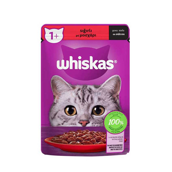 ویسکاس پوچ گربه با طعم گوشت گاو Whiskas with Beef را به صورت خورشتی تولید کرده است که همه نیازها را تامین می کند و ارزش غذایی بالایی دارد.