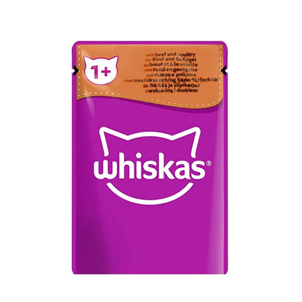 ویسکاس پوچ ژله ای با طعم گوشت گاو و طیور Whiskas Beef & Poultry را برای گربه های بالغ با فرمولاسیون سرشار از ویتامین ها و مواد معدنی تولید کرده است.