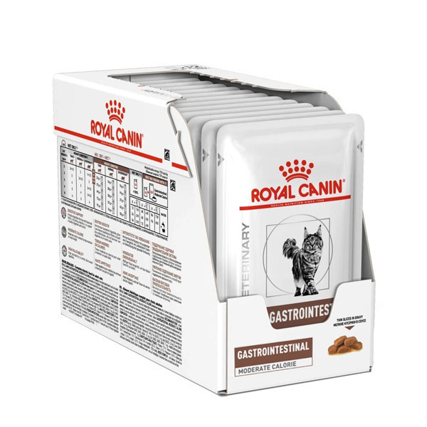 پوچ رویال کنین مدل گسترو اینتستینال مدریت کالری برای گربه های بالغ مبتلا به بیماری های گوارشی تولید شده است. این محصول از بروز اضافه وزن پیشگیری می کند.