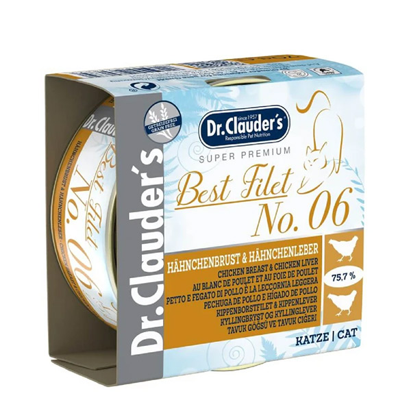 دکتر کلادرز کنسرو با طعم سینه مرغ و جگر Best Filet Chicken Breast & Liver را برای گربه های بالغ همه نژادها تولید کرده و کیفیت بسیار بالایی دارد.