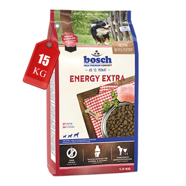 غذای سگ بالغ بوش Bosch Energy Extra مدل پرمیوم اکسترا انرژی کالری بالایی دارد و برای سگ هایی که فعالیت زیادی دارند، توصیه می شود.